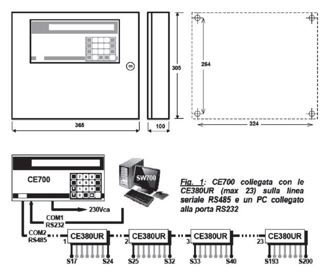 The microprocessor central unit is usable for big industrial applications and it is arranged to operate matched with remote units type CE380UR which manage 8 sensors each. On the CE700 it is possible to connect max 23 remote units for a total of 184 detectors and relays (with ES480UR boards).Considering 16 inputs and 16 relays available directly in central through specific expansion boards, the total is of 200 detectors and 200 relays available.