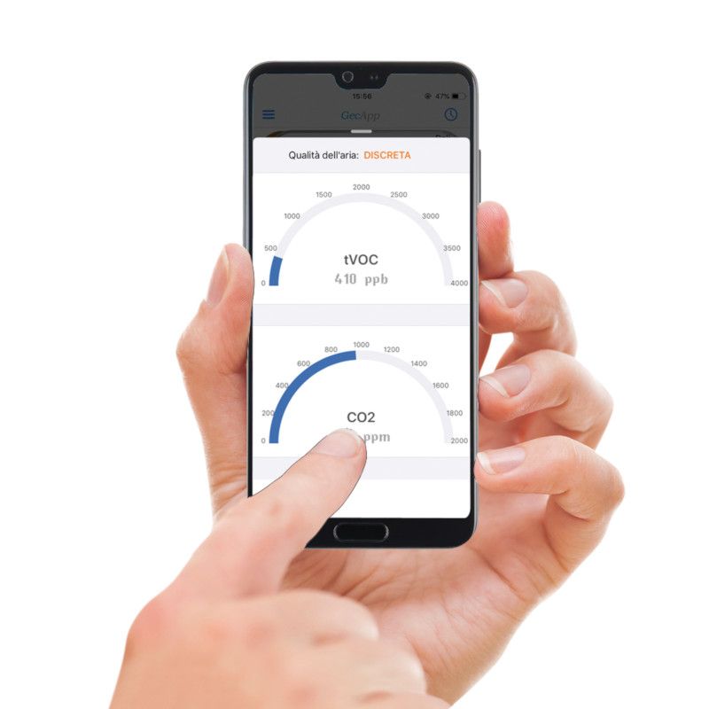 Una banda a led sul dispositivo (disattivabile) indica visivamente lo stato di salubrità dell’aria, illuminandosi in tre differenti colori. L’App, che è in grado di gestire più cronotermostati contemporaneamente dallo stesso smartphone, consente di accendere e spegnere l’impianto di riscaldamento o condizionamento, programmare il funzionamento settimanale, commutare in modalità manuale, impostare la funzione antigelo e attivare, in caso di necessità, gli allarmi di superamento delle temperature impostate. Grazie alla geolocalizzazione, il dispositivo può essere attivato/disattivato automaticamente in base alla distanza dell’utente dall’abitazione.
