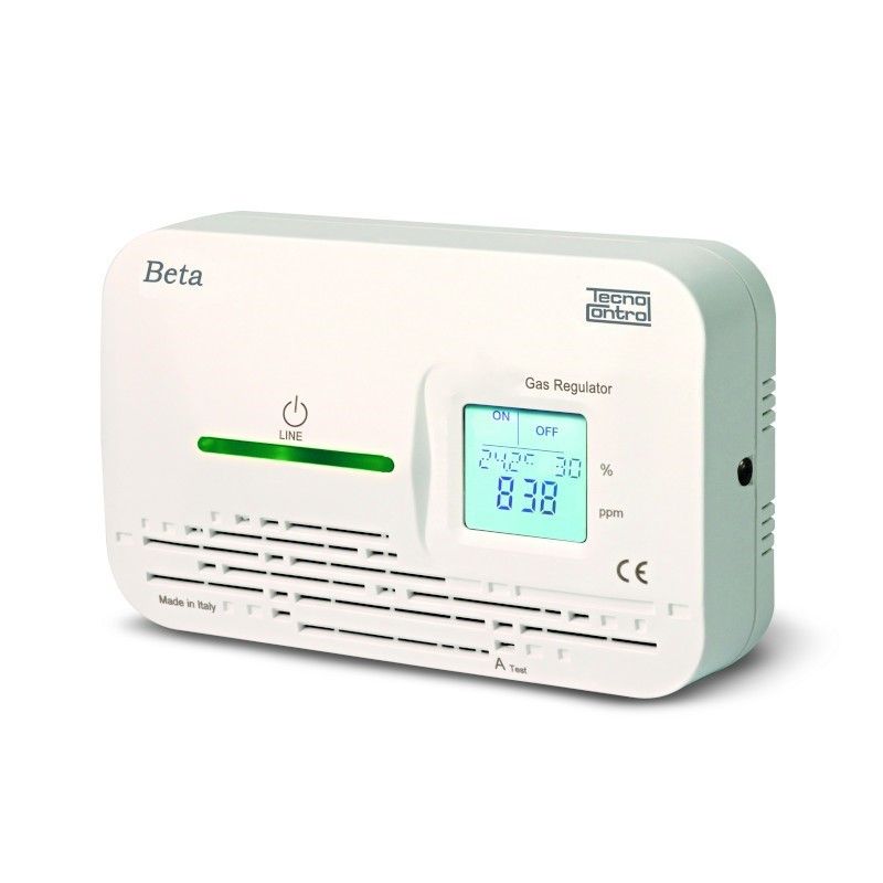 Domestic Carbon Dioxide wall mountable regulator. It is able to measure the quantity of Carbon Dioxide within a closed environment through an accurate detector set inside it. In addition to Carbon Dioxide, the detector also measures Temperature and Humidity so to provide the user as much information as possible relative to the environmental healthiness.